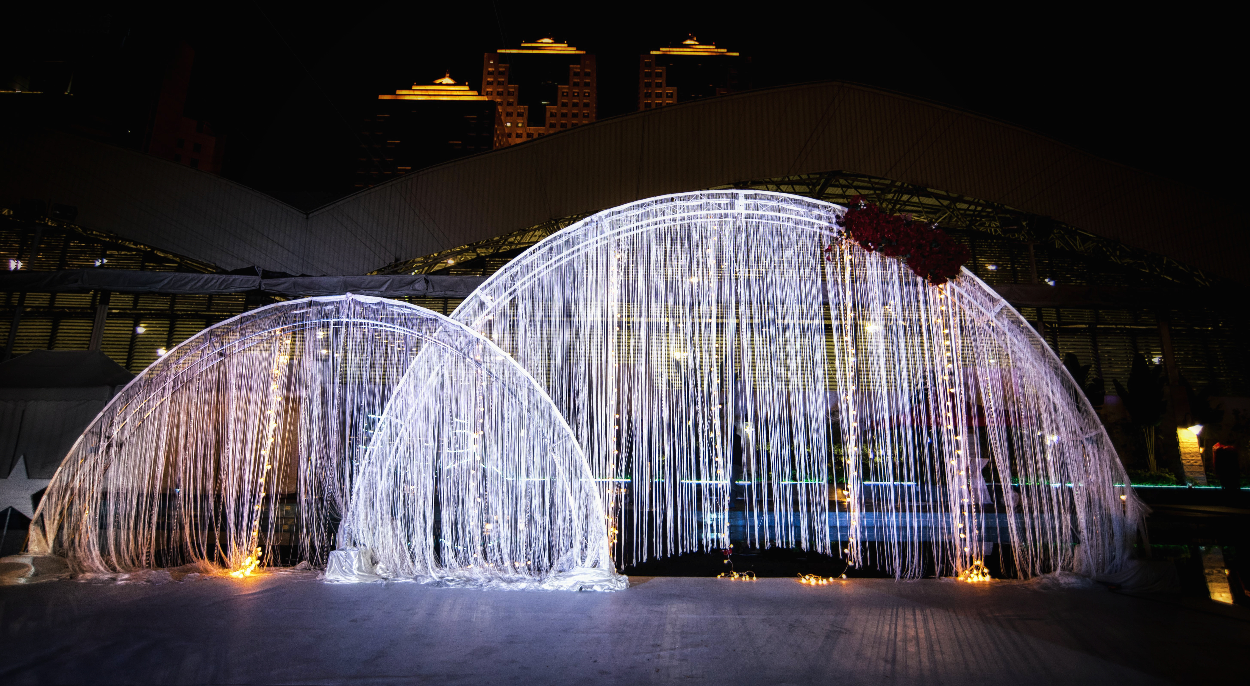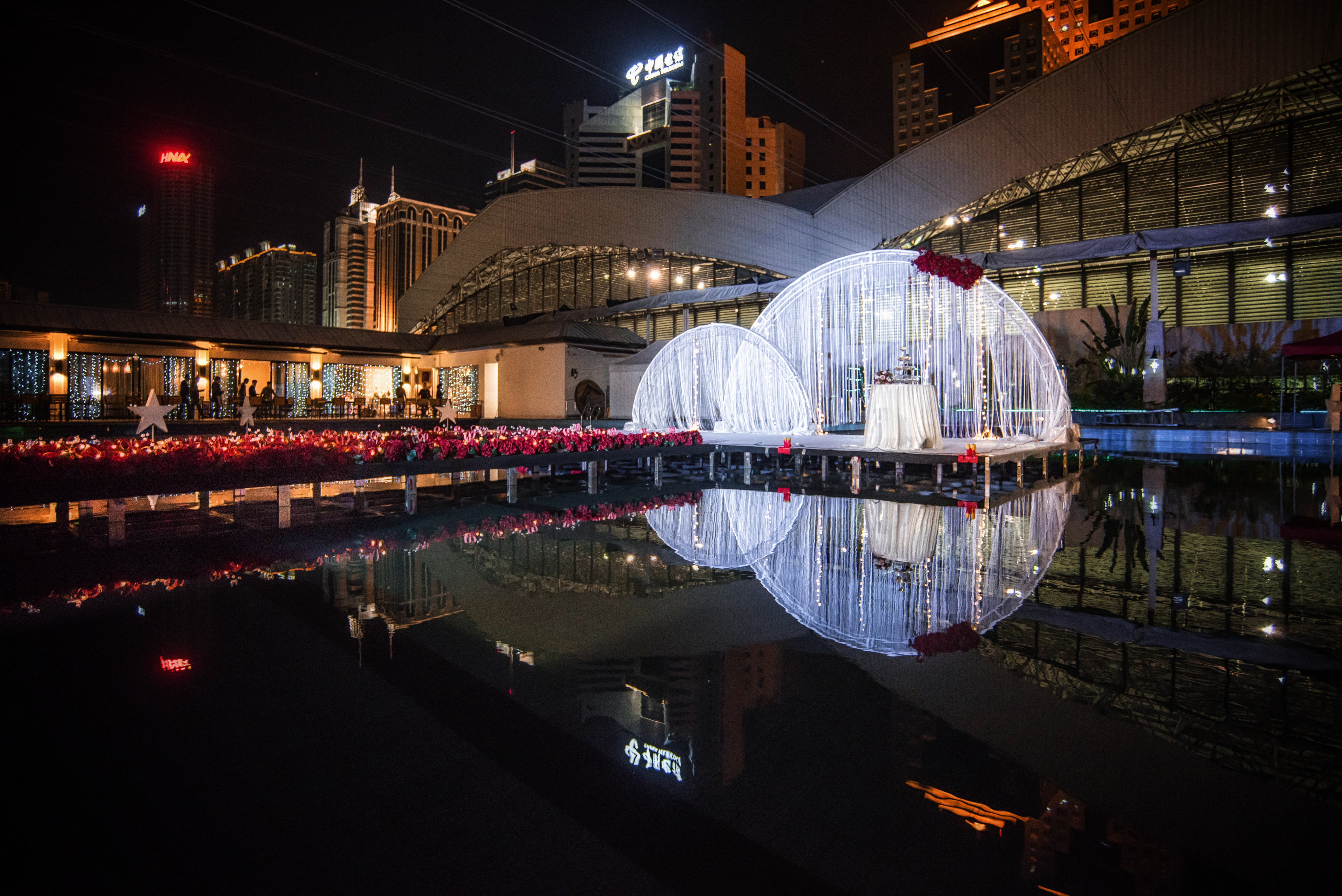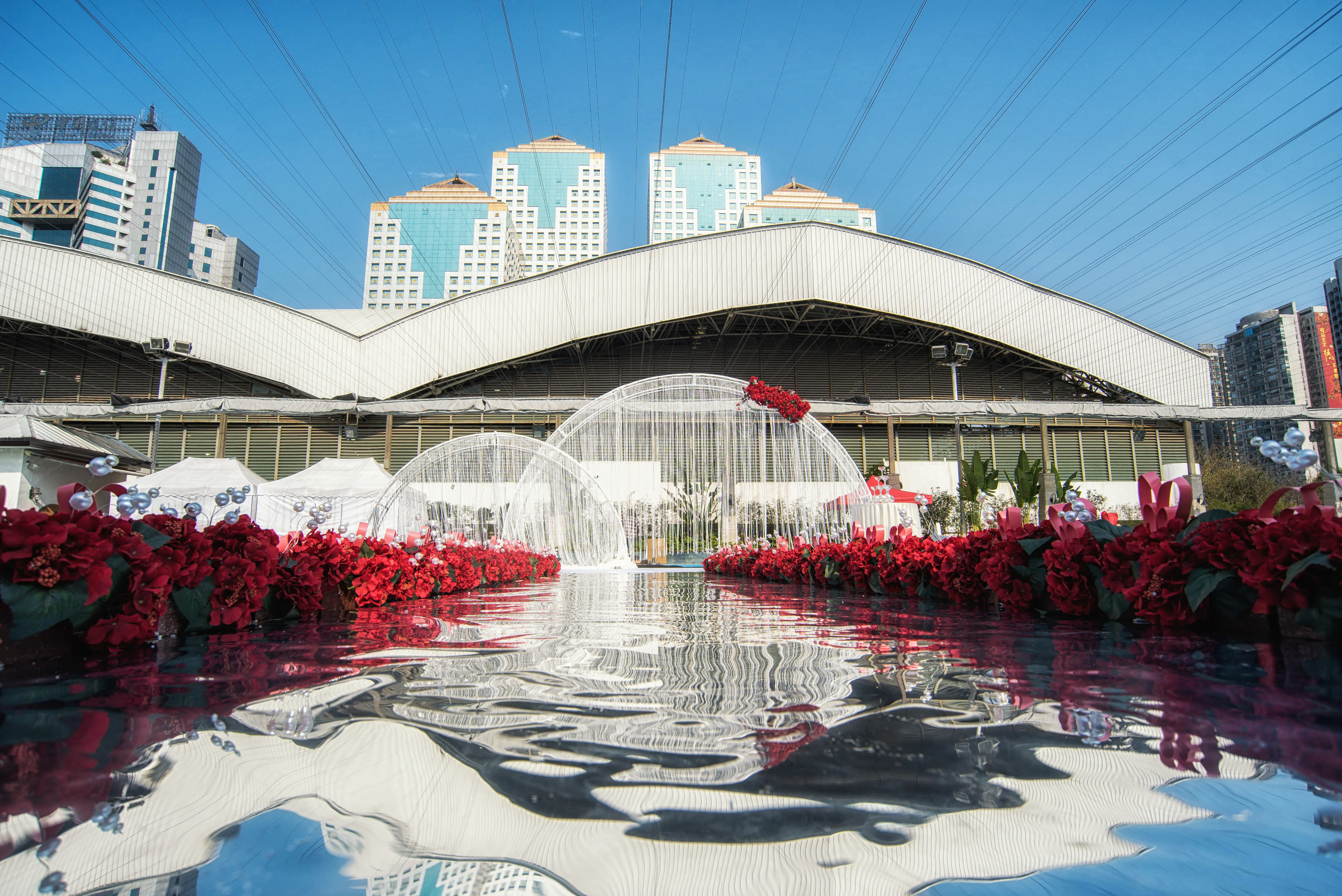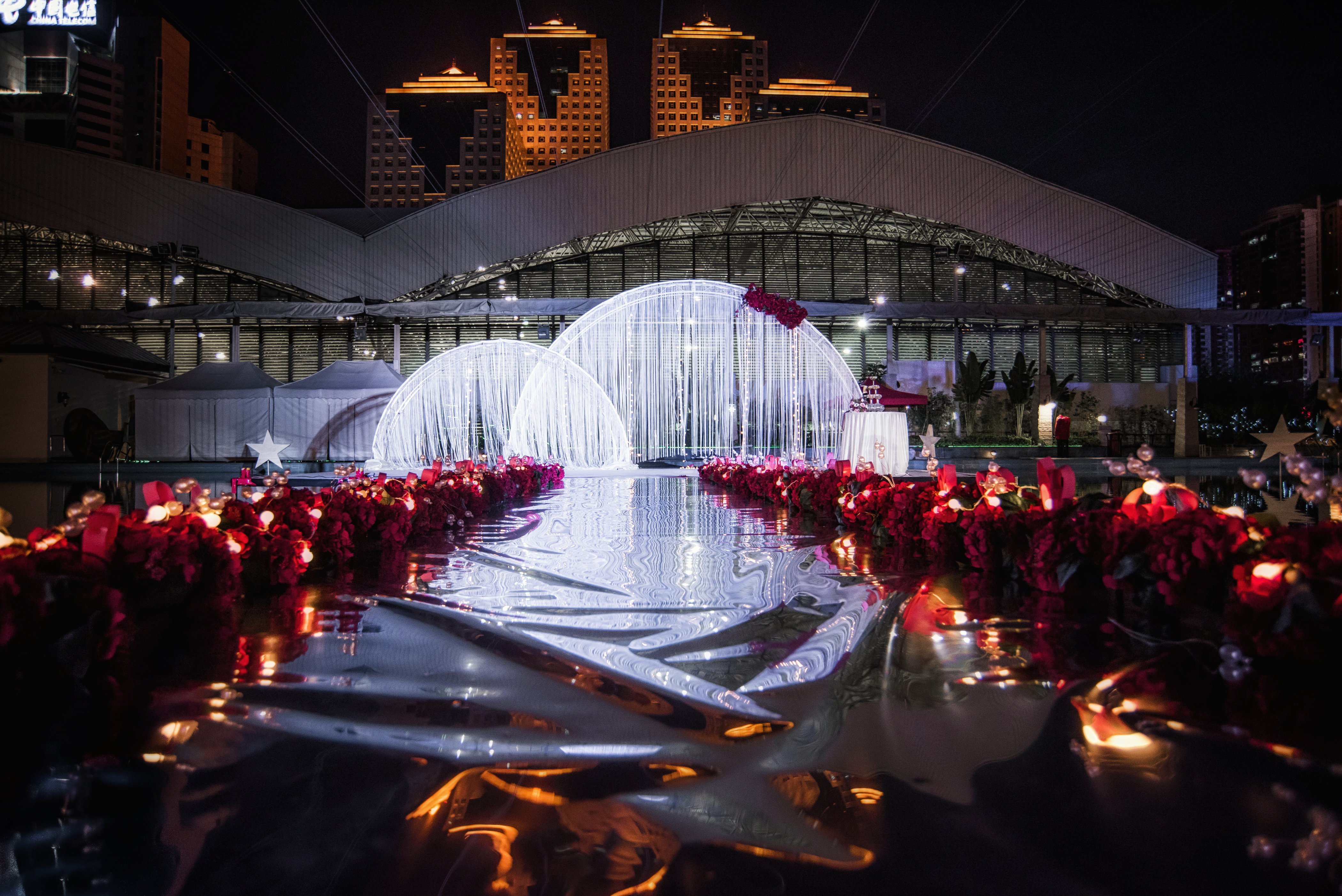 婚礼全场布置以红、白为主色调,在泳池浅蓝色的光泽中,显得格外鲜明活泼。T型主舞台延泳池水面架空搭设,将场地、布置和灯光结合在一起,夜幕降临时,灯光与水中倒影汇成一片繁华的美景,新人和宾客尽情在水中舞动,现场欢乐无比!