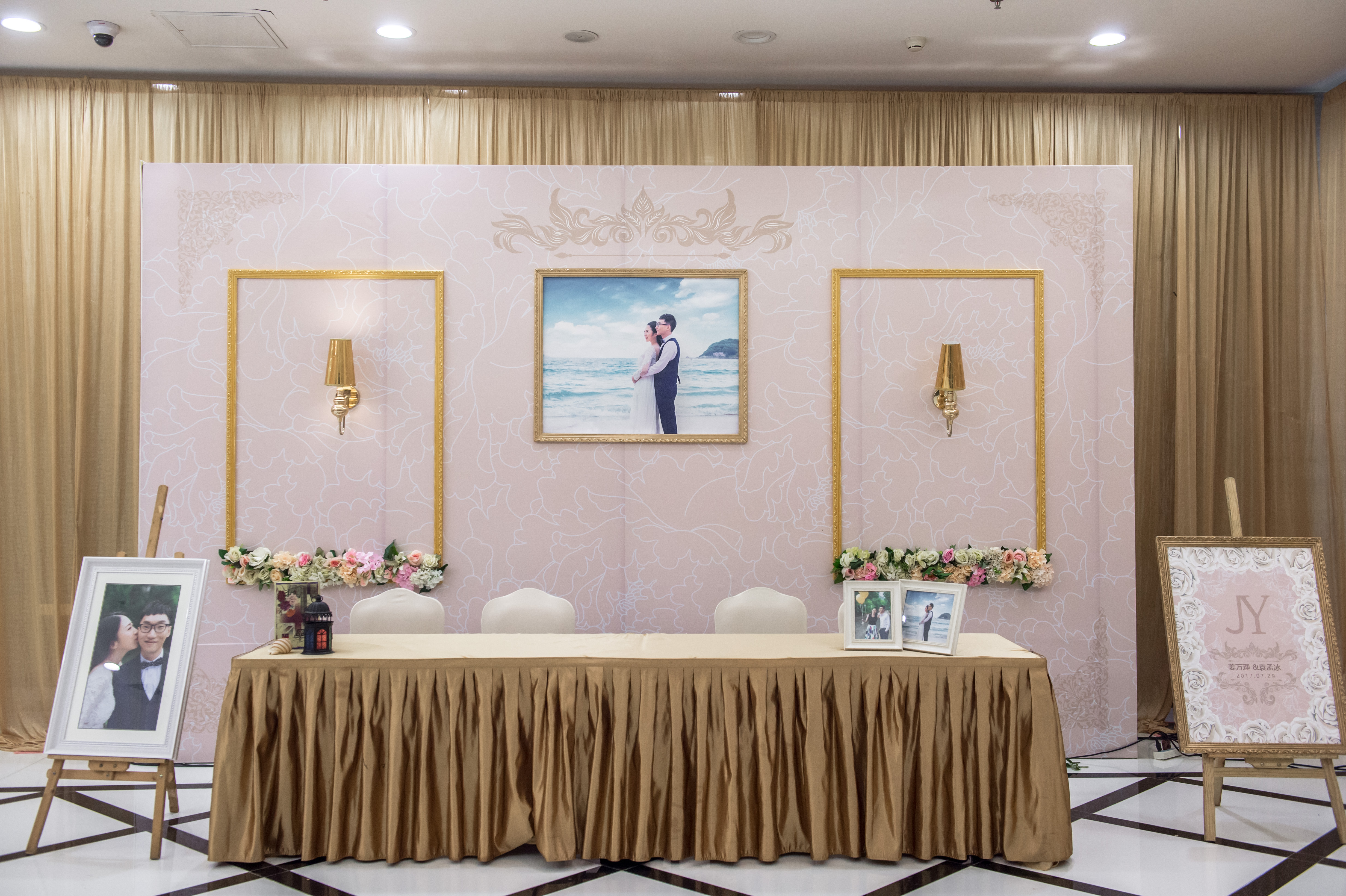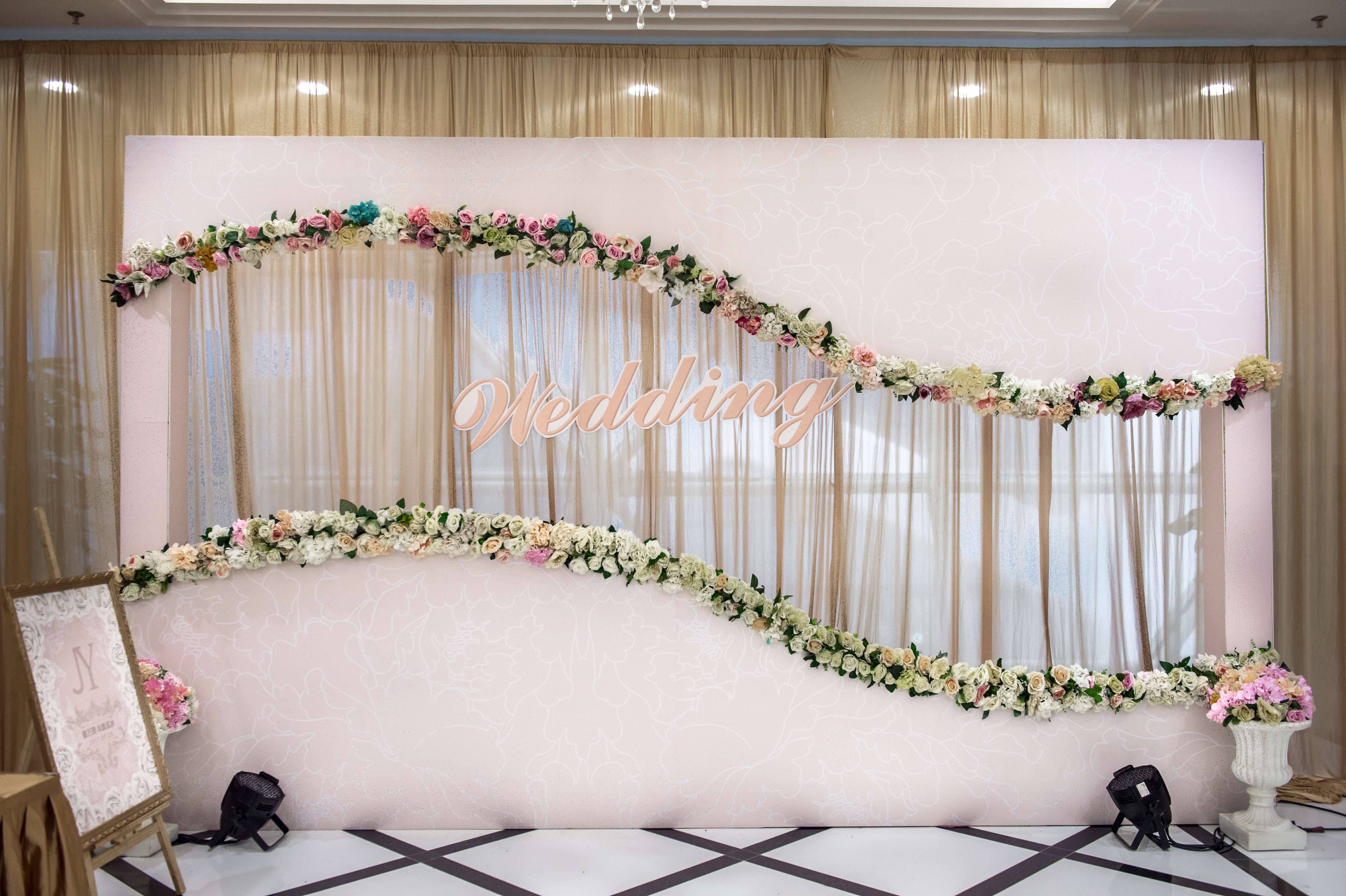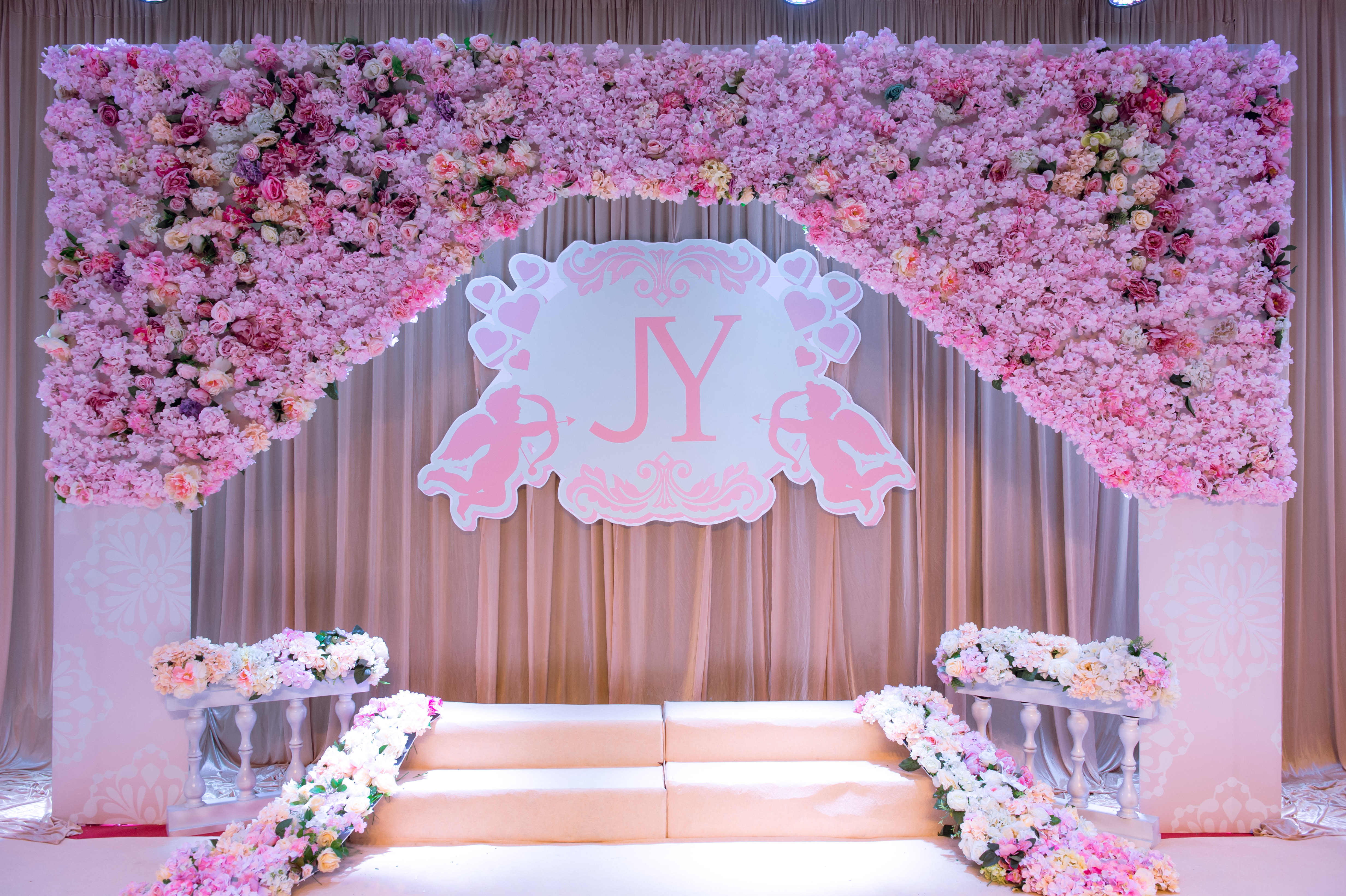 纱幔打底 KT板作为主要 KT板上插花艺 镜面T台 罗马柱路引 4盏帕灯